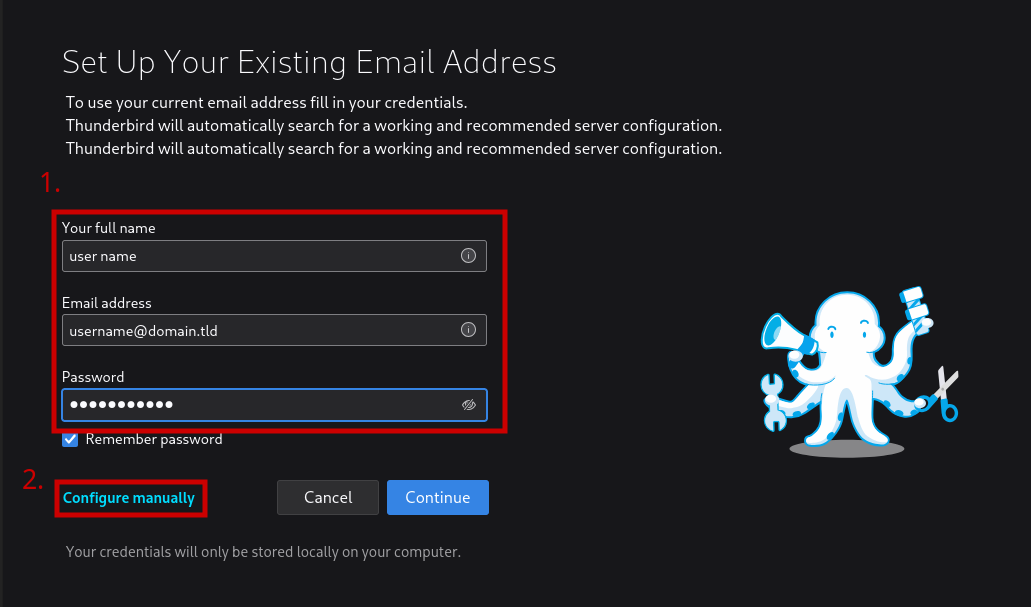To manually configure a new account in Thunderbird Desktop, add the account information, then click on 'Configure manually'.