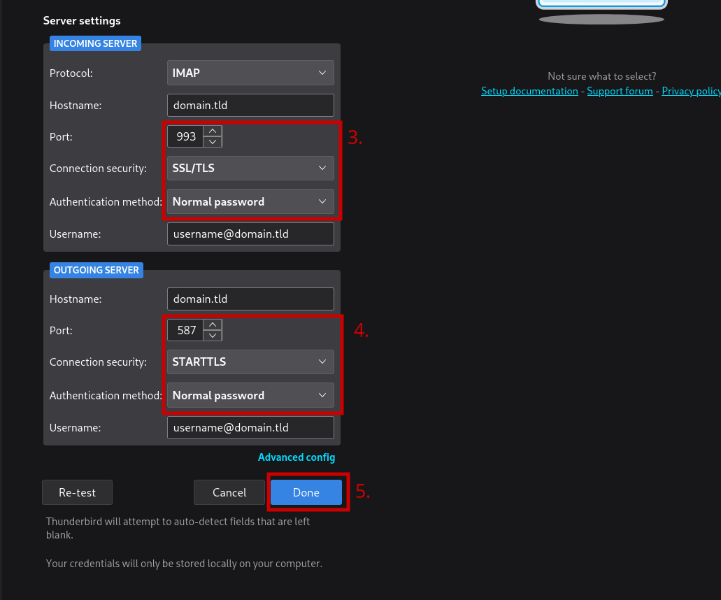 Modern mail clients should be able to configure themselves automatically. If autoconfiguration fails, you can do it manually following the instructions below. (If the autoconfiguration fails though, it should be understood as a bug in YunoHost, and we would be glad to read your feedback to try to reproduce the issue on our side!)
